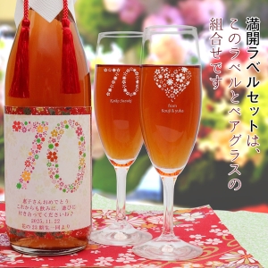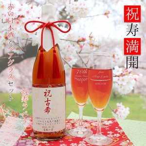 古希の記念にお名前やメッセージを入れた 赤い日本酒とペアグラスのセット