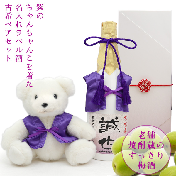 紫のちゃんちゃんこを着た名入れラベル酒<すっきり梅酒・古希ベアセット>