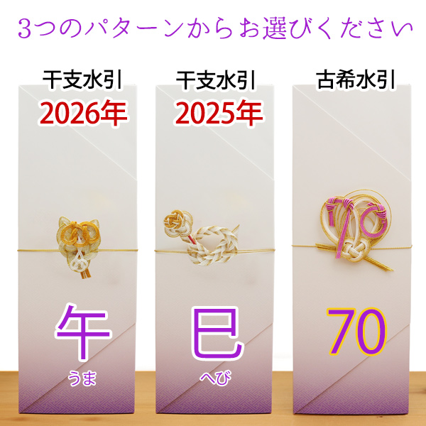 まず、箱の色合いはラベルと合わせて、古希や喜寿、卒寿のお祝いカラーの紫色を基調に、水引でお祝いらしさを演出しました。