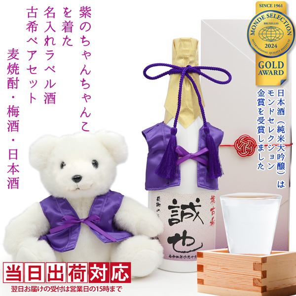 紫のちゃんちゃんこを着た名入れラベル酒<古希ベアセット>